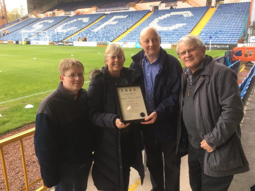 14Nov 2019 by scan Relatives of Jimmy Morris receiving his certificate from Ian Watts at Edgeley Park on the 2nd November 2019.