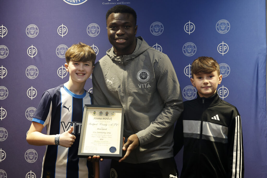 Adama Sidibeh was presented with his certificate at Edgeley Park. 21/2/26