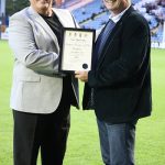 Ian Holbrook receiving his certificate from John Whelan at Edgeley Park on the 13th August 2019.