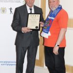 Ron Guy receives his certificate from Graham Privett at Edgeley Park on 2nd March 2019.